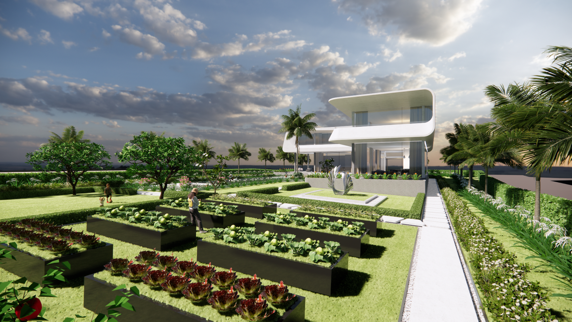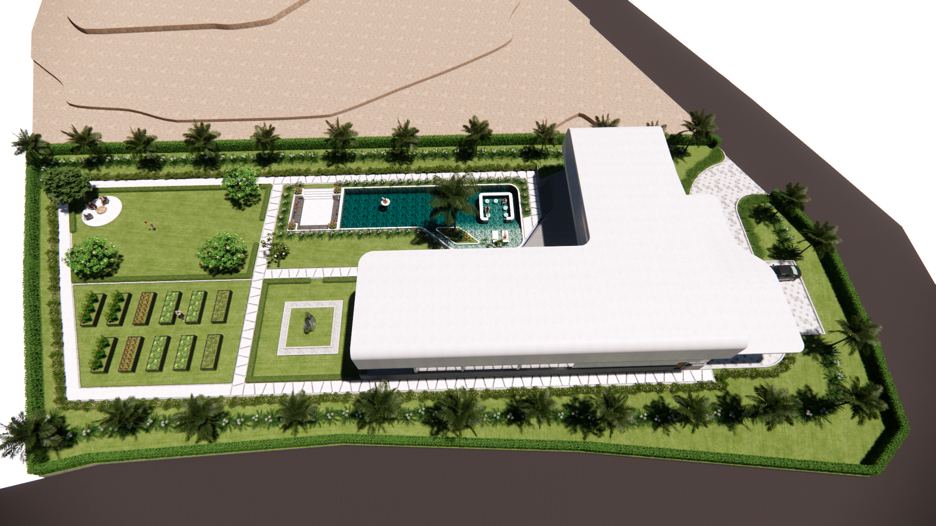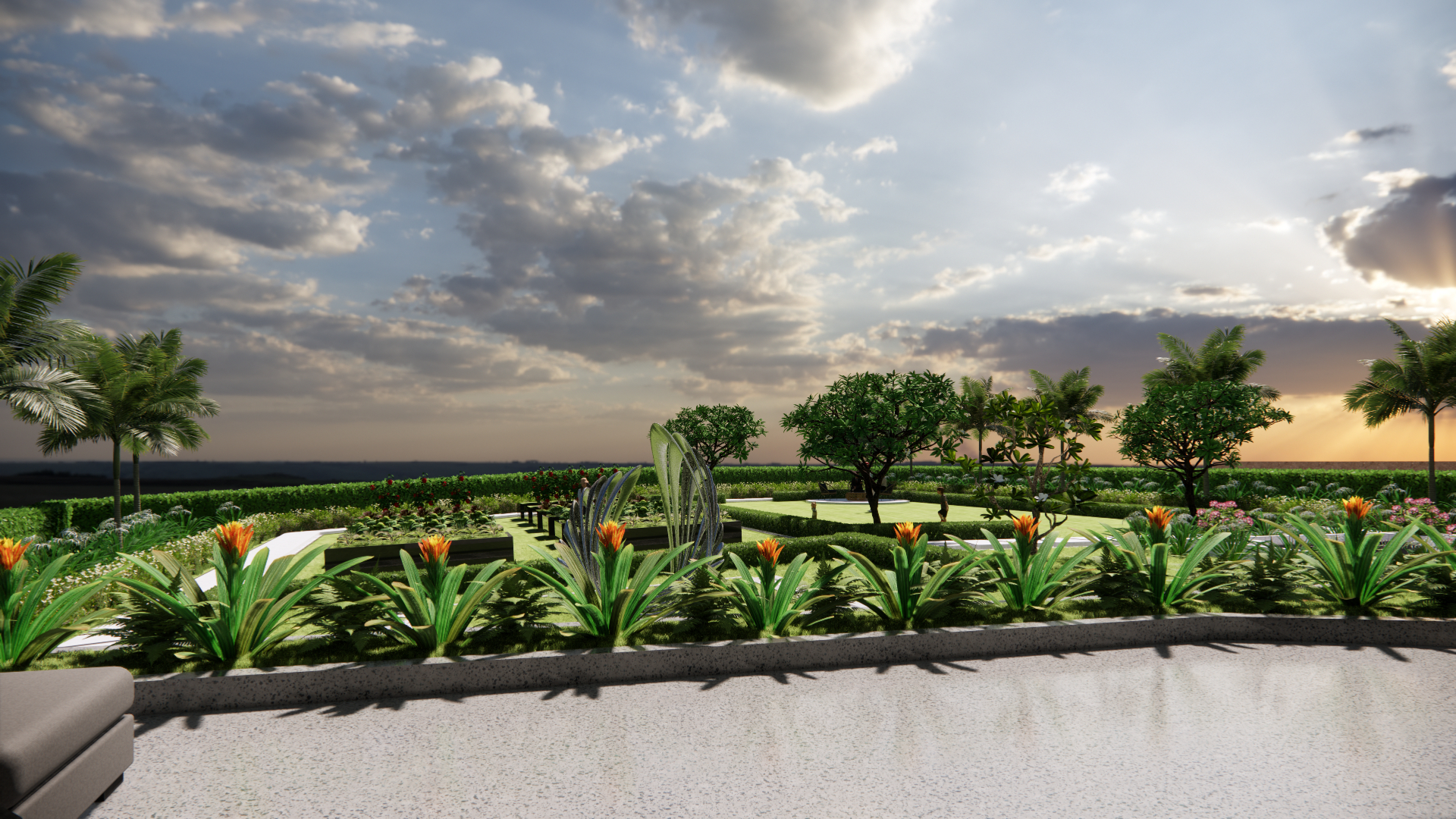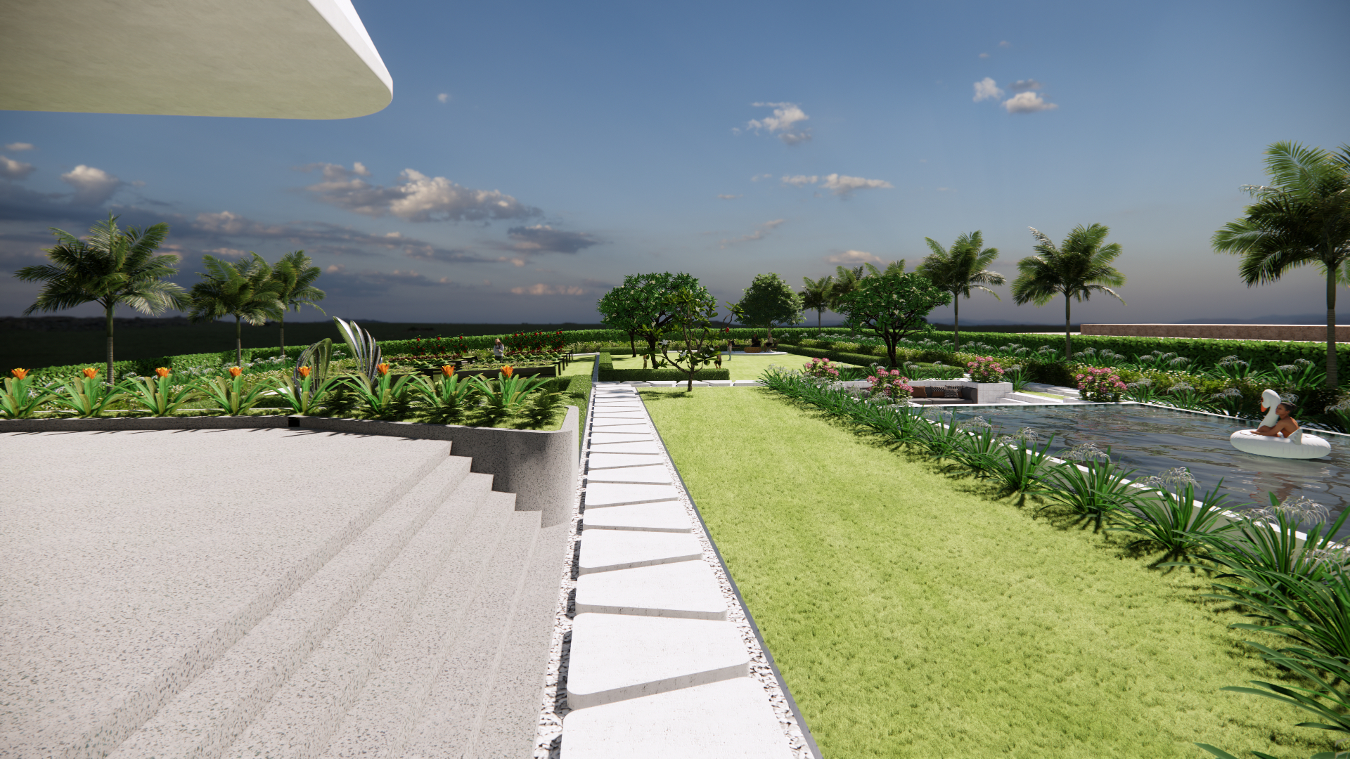 The landscape design draws inspiration from tropical elegance, creating a luxurious and serene outdoor space that harmonizes with the natural surroundings. The design incorporates palm trees, local flowers, and thoughtfully arranged vegetation, blended with a clear water pool and modern garden layout to foster a relaxing ambiance. Tiered flower beds and winding pathways enhance visual depth while offering practical activity areas, emphasizing a balance of sustainability and ecological aesthetics for residents to enjoy a deeply connected natural living experience.