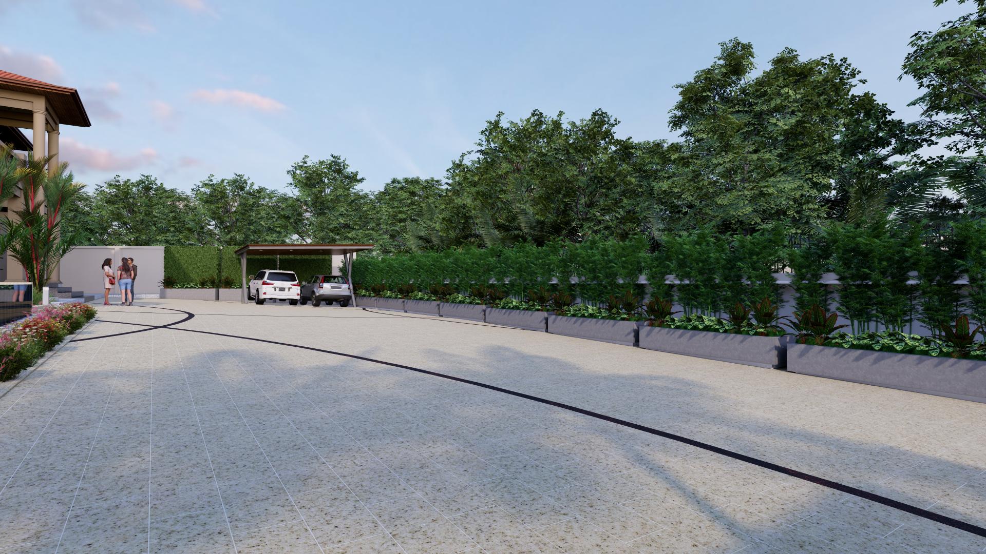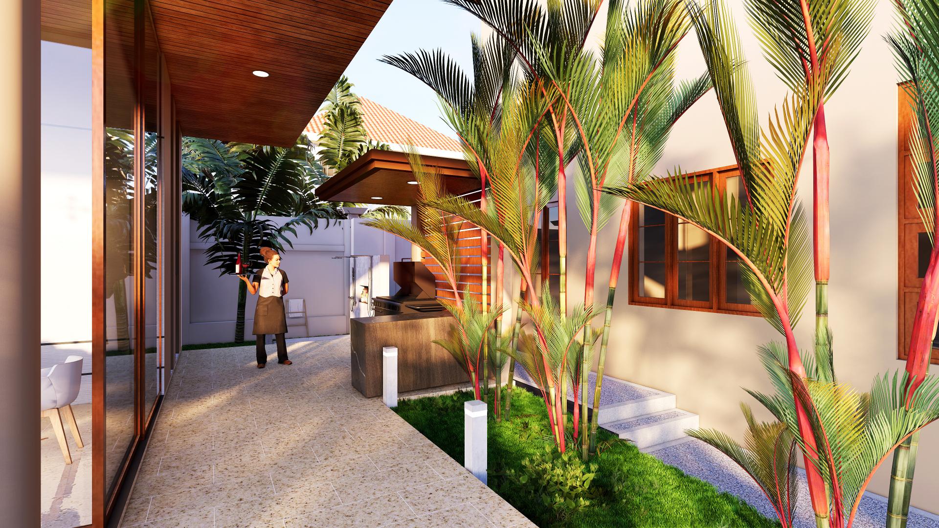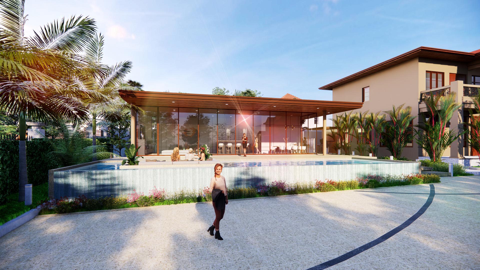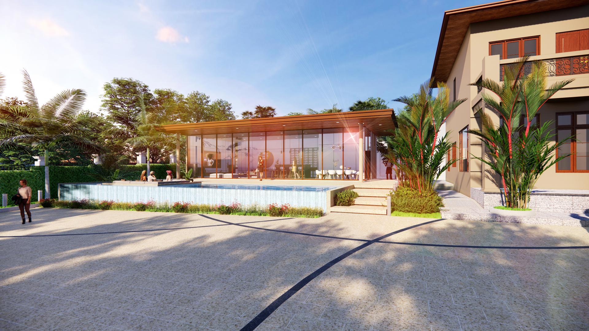 The landscape design of this villa draws inspiration from tropical natural scenery, seamlessly blending modern architecture with the surrounding greenery to create an open, flowing, and vibrant outdoor space. Through the layered arrangement of palm trees, ferns, and local tropical vegetation, combined with an infinity pool and winding stone pathways, the design emphasizes a seamless connection with the environment, allowing sunlight and breezes to naturally permeate. This layout not only enhances visual dynamism but also incorporates sustainable elements, such as green walls and water reflections, creating a luxurious retreat atmosphere where residents can fully enjoy the tranquility and vitality of a tropical paradise.