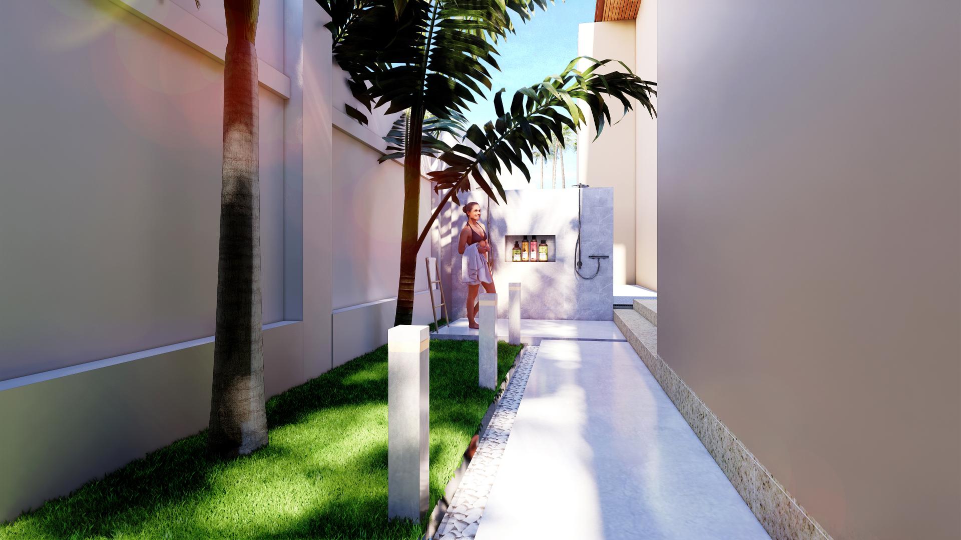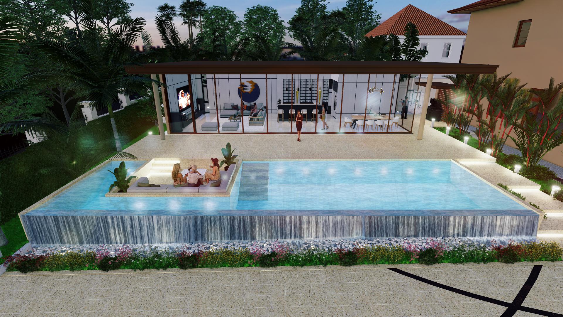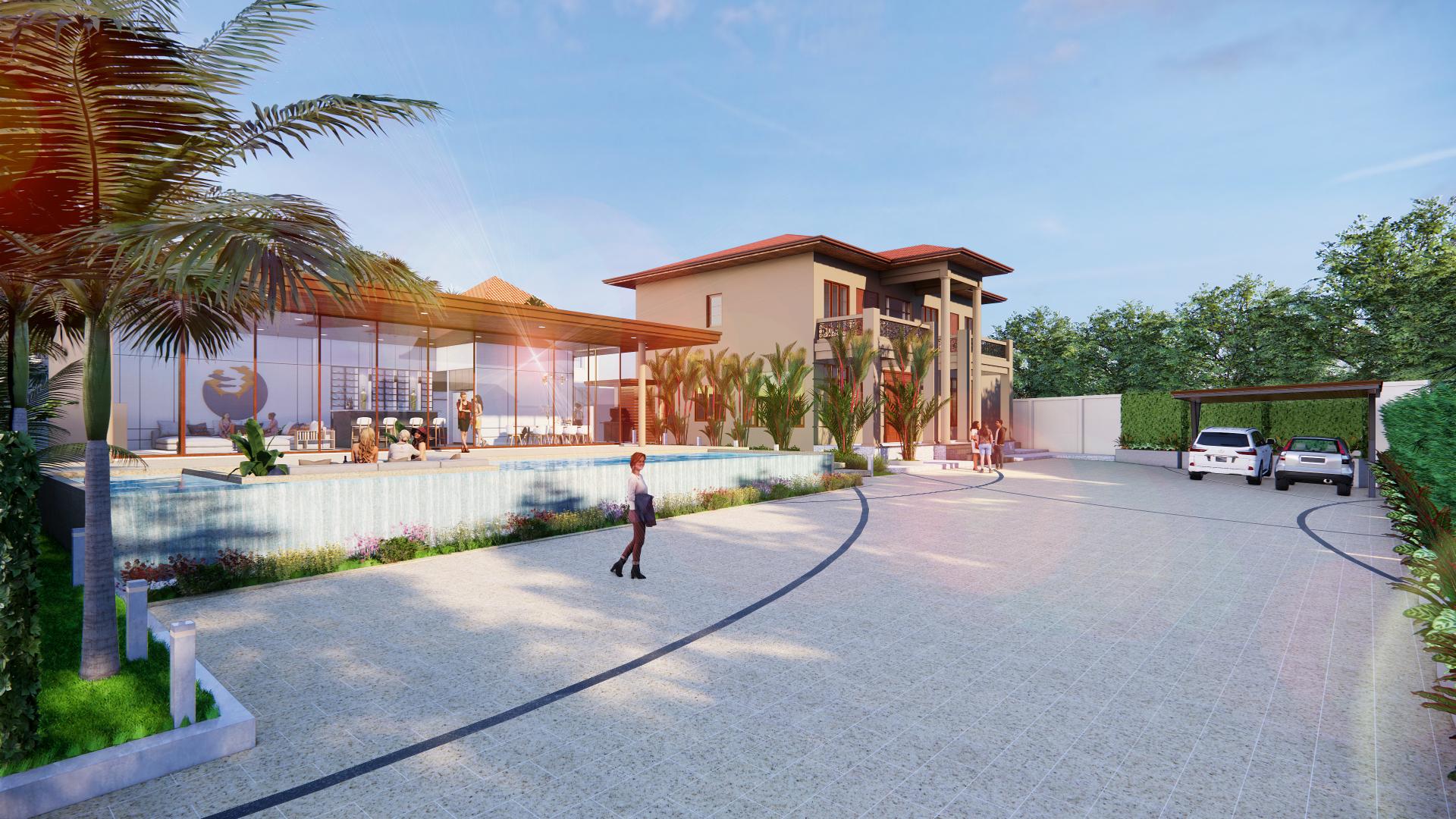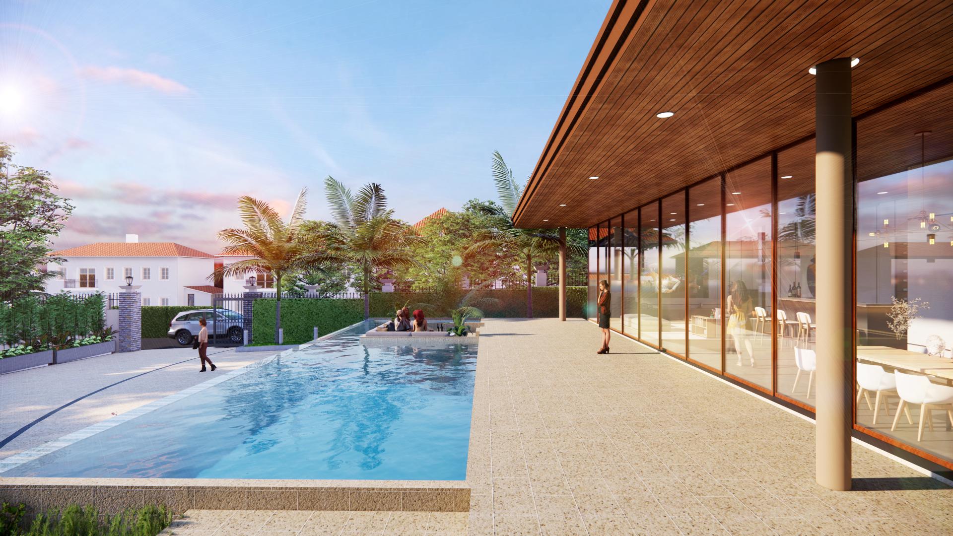 The landscape design of this villa draws inspiration from tropical natural scenery, seamlessly blending modern architecture with the surrounding greenery to create an open, flowing, and vibrant outdoor space. Through the layered arrangement of palm trees, ferns, and local tropical vegetation, combined with an infinity pool and winding stone pathways, the design emphasizes a seamless connection with the environment, allowing sunlight and breezes to naturally permeate. This layout not only enhances visual dynamism but also incorporates sustainable elements, such as green walls and water reflections, creating a luxurious retreat atmosphere where residents can fully enjoy the tranquility and vitality of a tropical paradise.