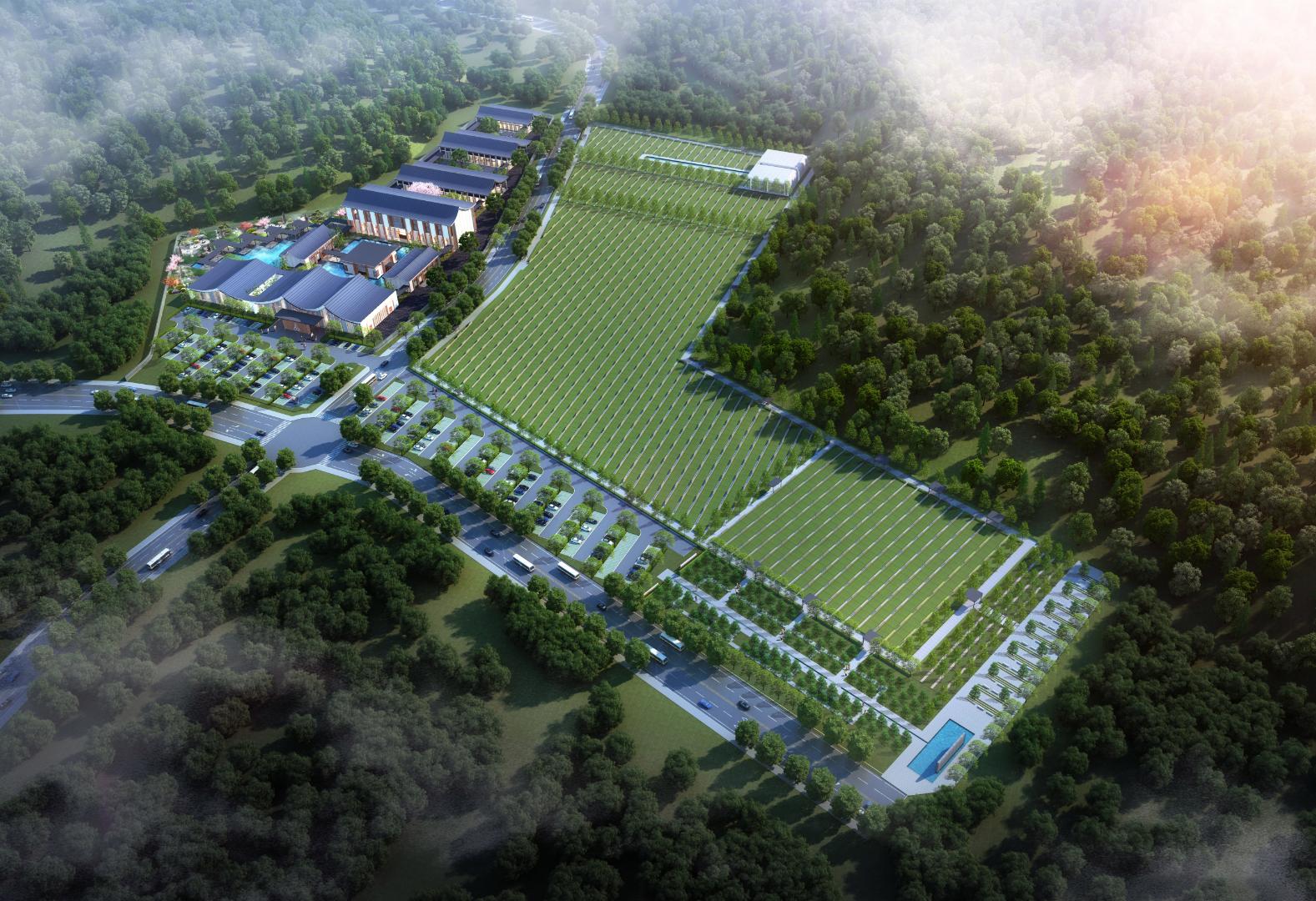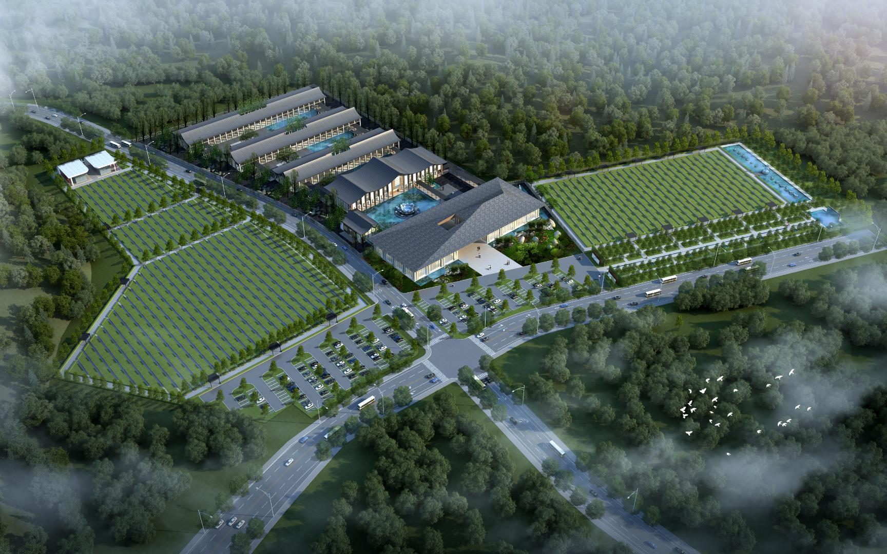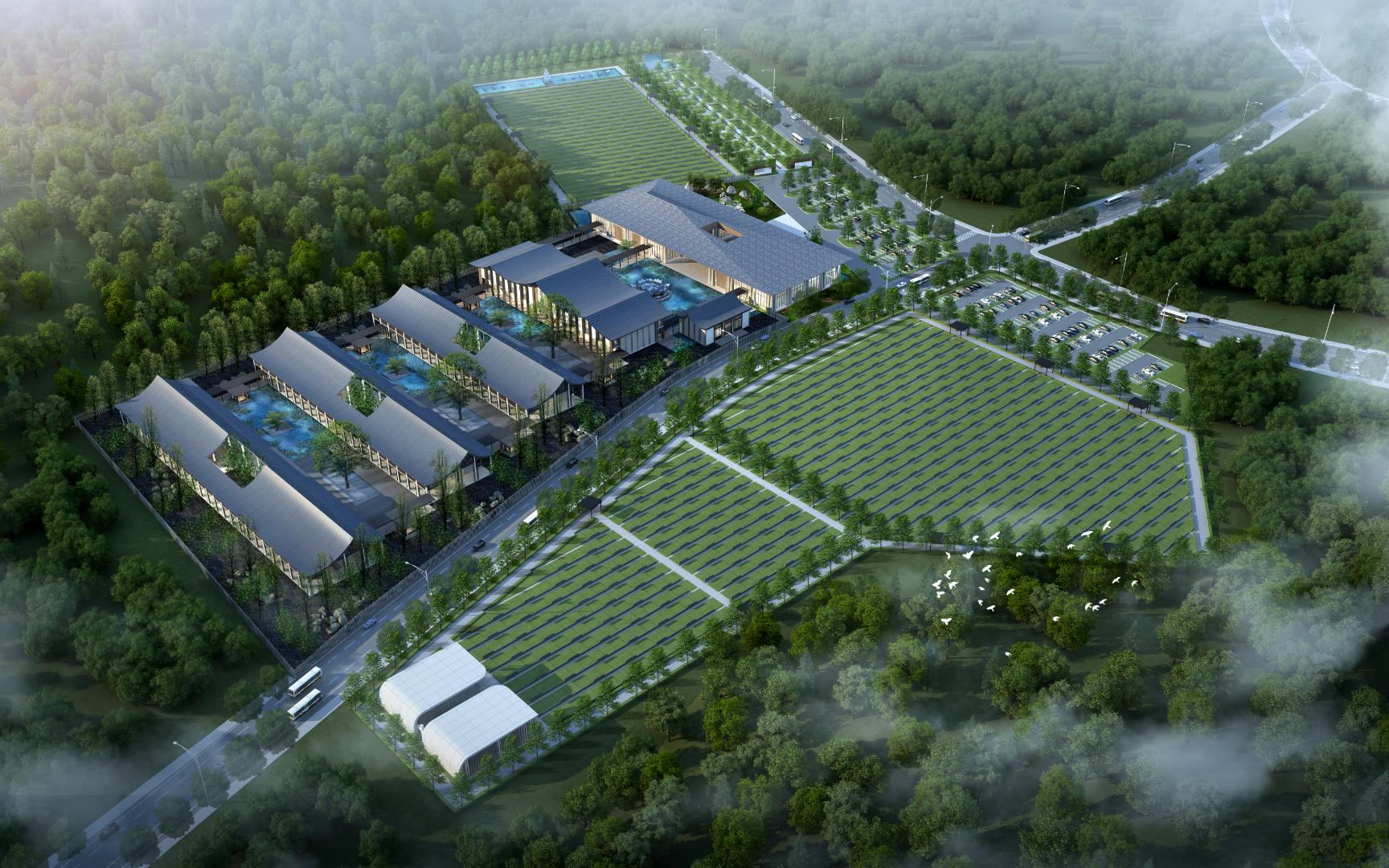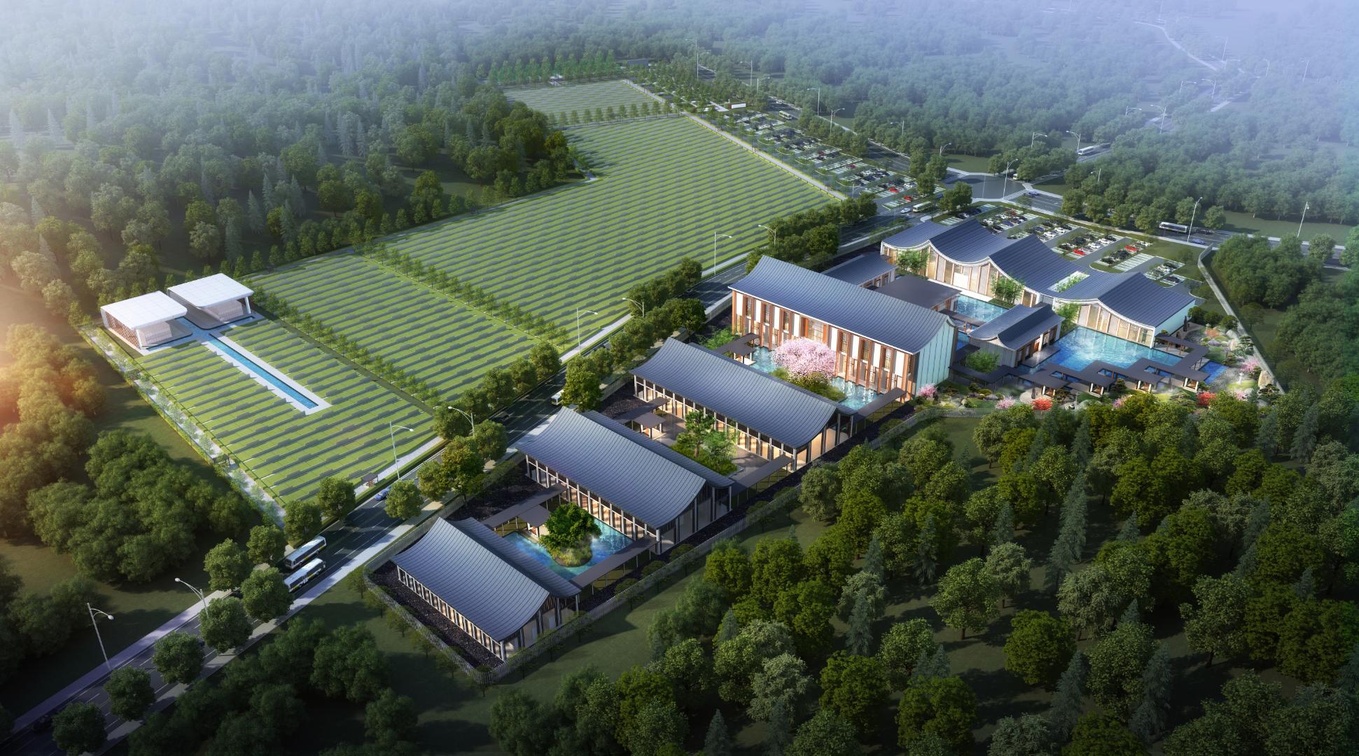 Set against the backdrop of mountains and forests, the design blends elements of traditional Eastern architecture with contemporary simplicity, resulting in an atmosphere that is both solemn and warm. The flowing rooflines and open courtyard layouts symbolize the cycle of life and the harmony between heaven and earth. Water features, greenery, and walking paths intertwine to provide a tranquil environment, transforming remembrance into a journey of reflection and healing.